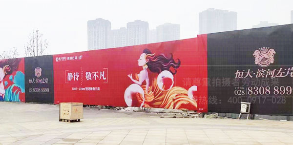 7、施工圍墻圍擋噴繪廣告:施工圍墻圍擋能夠?qū)⑹┕すさ睾屯饨鐝氐赘綦x,以免其他人進入施工地區(qū)發(fā)生危險,保持施工圍擋的整潔美觀,而不影響市容市貌。同時在圍墻圍擋上安裝噴繪廣告畫面為樓盤宣傳廣告提供渠道。