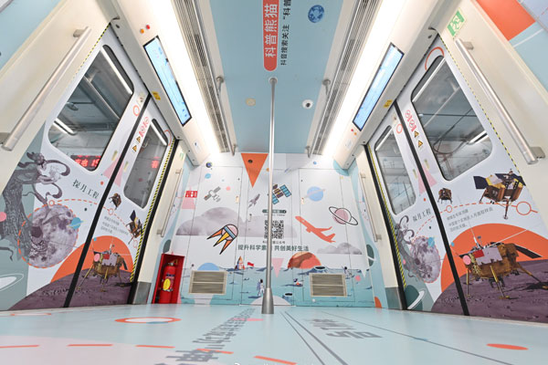 科普熊貓主題列車(chē)將分為海洋車(chē)廂、天空車(chē)廂和陸地車(chē)廂。走進(jìn)列車(chē)內(nèi),記者發(fā)現(xiàn)這輛車(chē)與平時(shí)有很大變化,車(chē)門(mén)、車(chē)窗、廣告欄等布置一新,環(huán)顧四周都是主題鮮明、內(nèi)容準(zhǔn)確,圖文并茂、視覺(jué)沖擊強(qiáng)烈的科普內(nèi)容。在車(chē)門(mén)上,還印有與天空相關(guān)的文字內(nèi)容,例如“世界第一枚液體燃料火箭”“航天時(shí)代的開(kāi)始”“神舟一號(hào)”等等,觸目皆可獲取與天空相關(guān)的科普知識(shí)。