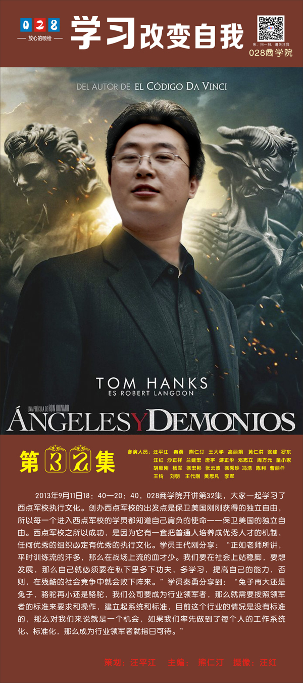 2013年9月11日18:40—20:40,成都廣告公司028商學院開講第32集,大家一起學習了西點軍校執(zhí)行文化。創(chuàng)辦西點軍校的出發(fā)點是保衛(wèi)美國剛剛獲得的獨立自由,所以每一個進入西點軍校的學員都知道自己肩負的使命——保衛(wèi)美國的獨立自由。西點軍校之所以成功,是因為它有一套把普通人培養(yǎng)成優(yōu)秀人才的機制,任何優(yōu)秀的組織必定有優(yōu)秀的執(zhí)行文化。