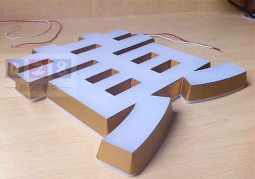 迷你發(fā)光字是采用亞克力材料,將亞克力材料經(jīng)過雕刻掏空成型,內(nèi)安裝LED燈,在將制作好的面板和底板粘結(jié)在一起制作而成