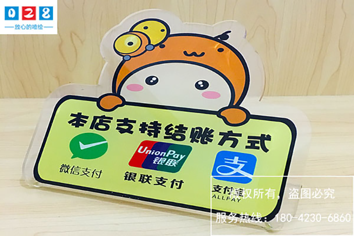 支付牌的制作材質(zhì): 大多數(shù)情況一般采用的是亞克力板來制作支付牌,可以是兩塊透明的亞克力板來制作,把支付碼夾在透明的亞克力板中間,促使其受到一個保護的作用,在不被人為破壞的情況下,該可以永久使用。亞克力板也可以是彩色的,運用雕刻切割來制作支付牌,可以是立體組裝豎立,也可以是掛飾吊牌。亞克力板的色澤效果是非常不錯的。